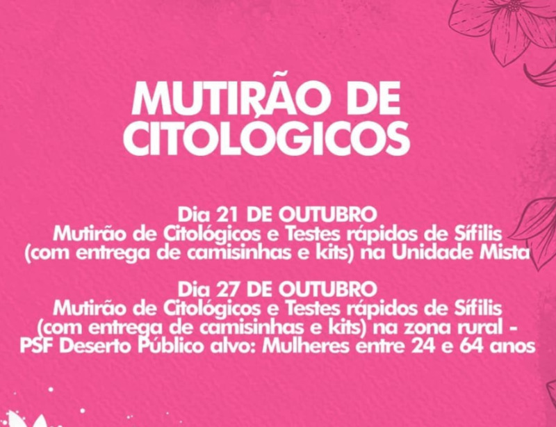A Prefeitura de São José de Caiana divulgou nesta terça-feira (19) a programação do Mutirão de Citológicos que será promovido pela Secretaria de Saúde.