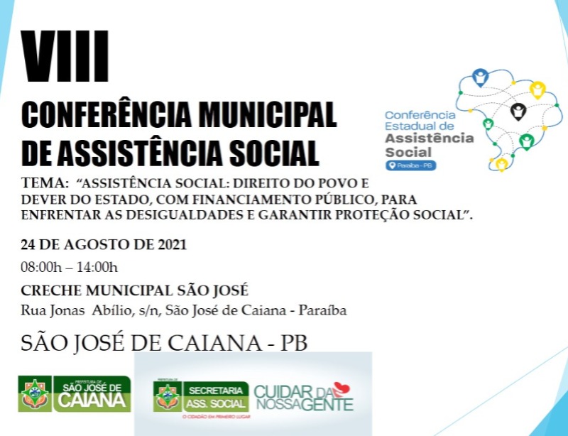 Será realizada na próxima terça-feira, dia 24 de Agosto, a VIII Conferência Municipal de Assistência Social do município de São José de Caiana. O evento é promovido pela secretaria municipal de Assistência Social em parceria com a prefeitura e toda a população está convidada a participar.