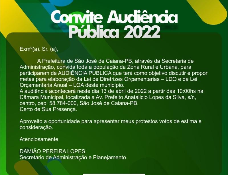 A Prefeitura municipal de São José de Caiana realiza nesta quarta-feira, dia 13 de Abril, uma audiência pública que terá como objetivo discutir e propor metas de elaboração da Lei de Diretrizes Orçamentárias (LDO) e da Lei Orçamentária Anual (LOA).