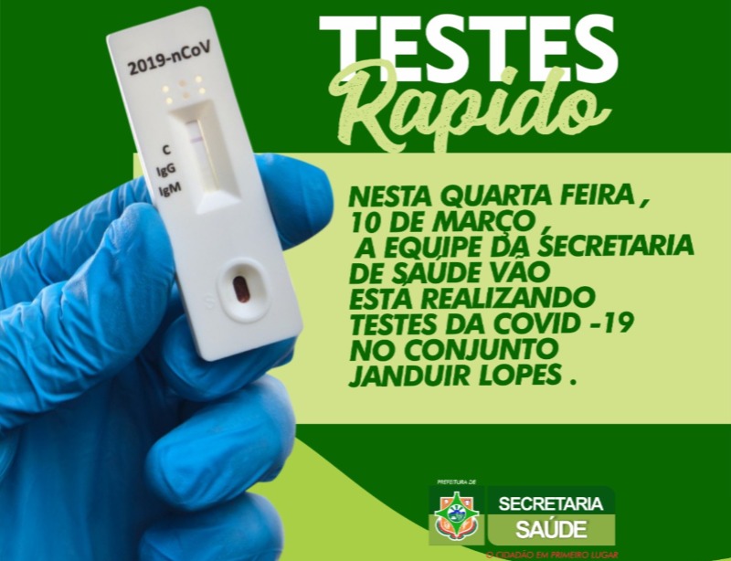 Nesta quarta-feira, 10 de março, a equipe da Secretaria de Saúde está realizando testes da covid -19 no conjunto Janduir Lopes. E nesta quinta-feira, dia 11, a testagem será realizada no conjunto Malvinas.