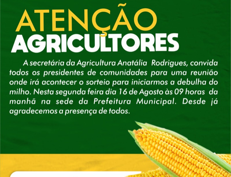 A reunião será realizada as 9 horas da manhã na sede da prefeitura municipal e, segundo a secretária de Agricultura Anatália Rodrigues, o encontro servirá para definir, através de sorteio, a ordem dos agricultores beneficiados com a Debulha do Milho.